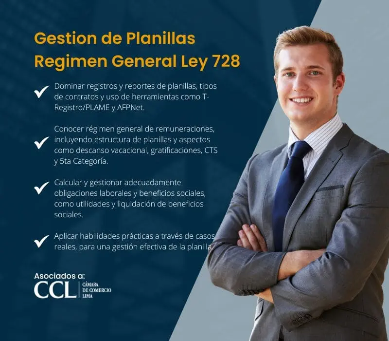 ✔ Adquirir habilidades sólidas en la gestión de planillas en régimen general según la Ley 728, abarcando aspectos como el cálculo de remuneraciones, beneficios laborales y la legalización de libros contables.